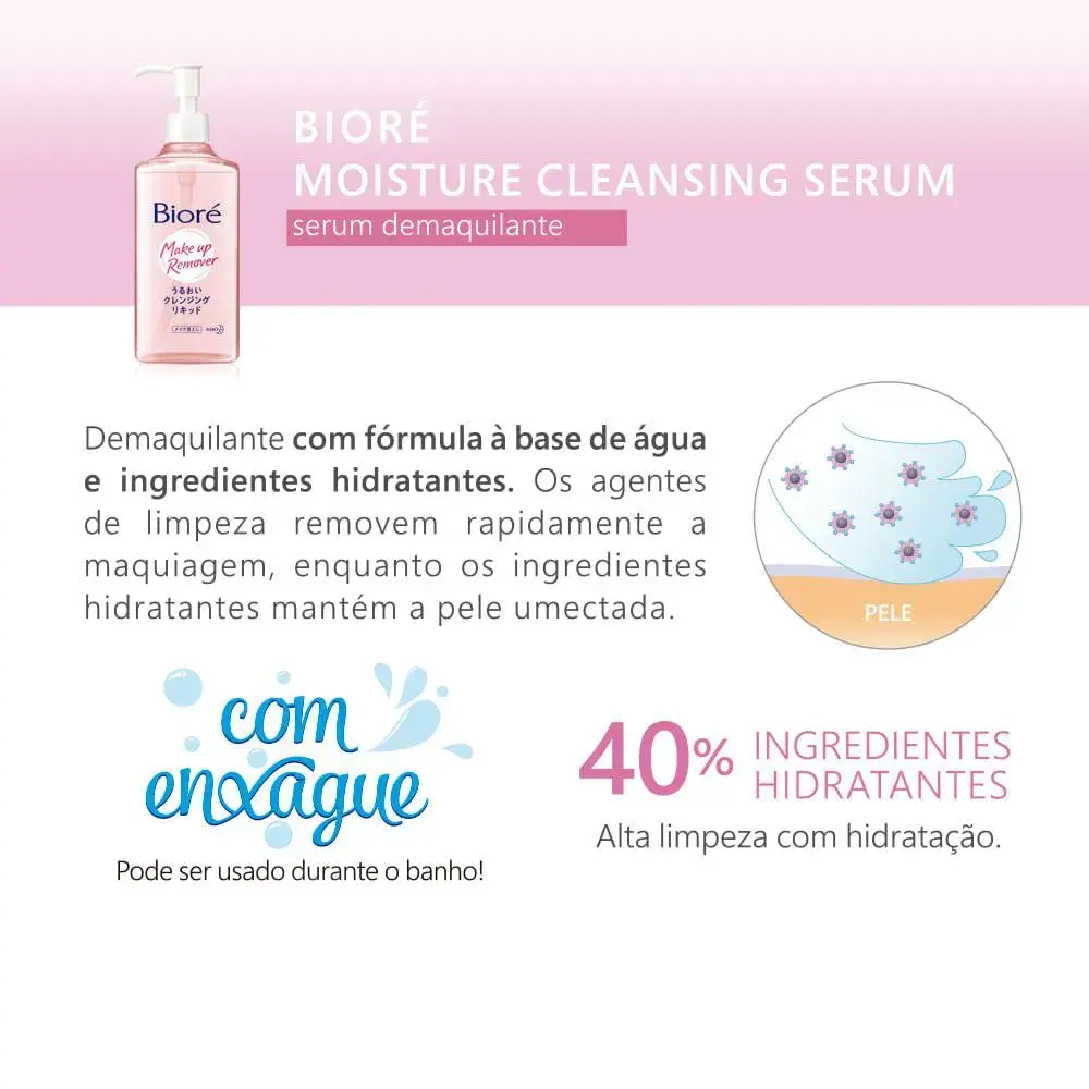 A inovação que transformará sua rotina de cuidados com a pele, proporcionando uma experiência única e eficaz na remoção da maquiagem. Este revolucionário sérum demaquilante é formulado para remover completamente toda e qualquer maquiagem, incluindo aquelas mais difíceis como máscara à prova d’água, delineador resistente, batom de longa duração e bases pesadas. Com tecnologia avançada vinda do Japão, o Sérum Demaquilante Bioré não apenas limpa profundamente seu rosto, mas também cuida dele. É um produto inovador no mercado brasileiro de beleza; trata-se de um limpador facial em formato sérum especialmente desenvolvido para oferecer uma limpeza completa sem deixar resíduos ou sensação oleosa na pele. Ideal para quem deseja praticidade aliada ao cuidado diário com a pele, este sérum pode ser utilizado mesmo durante o banho graças à sua fórmula exclusiva que funciona efetivamente tanto em peles secas quanto molhadas.